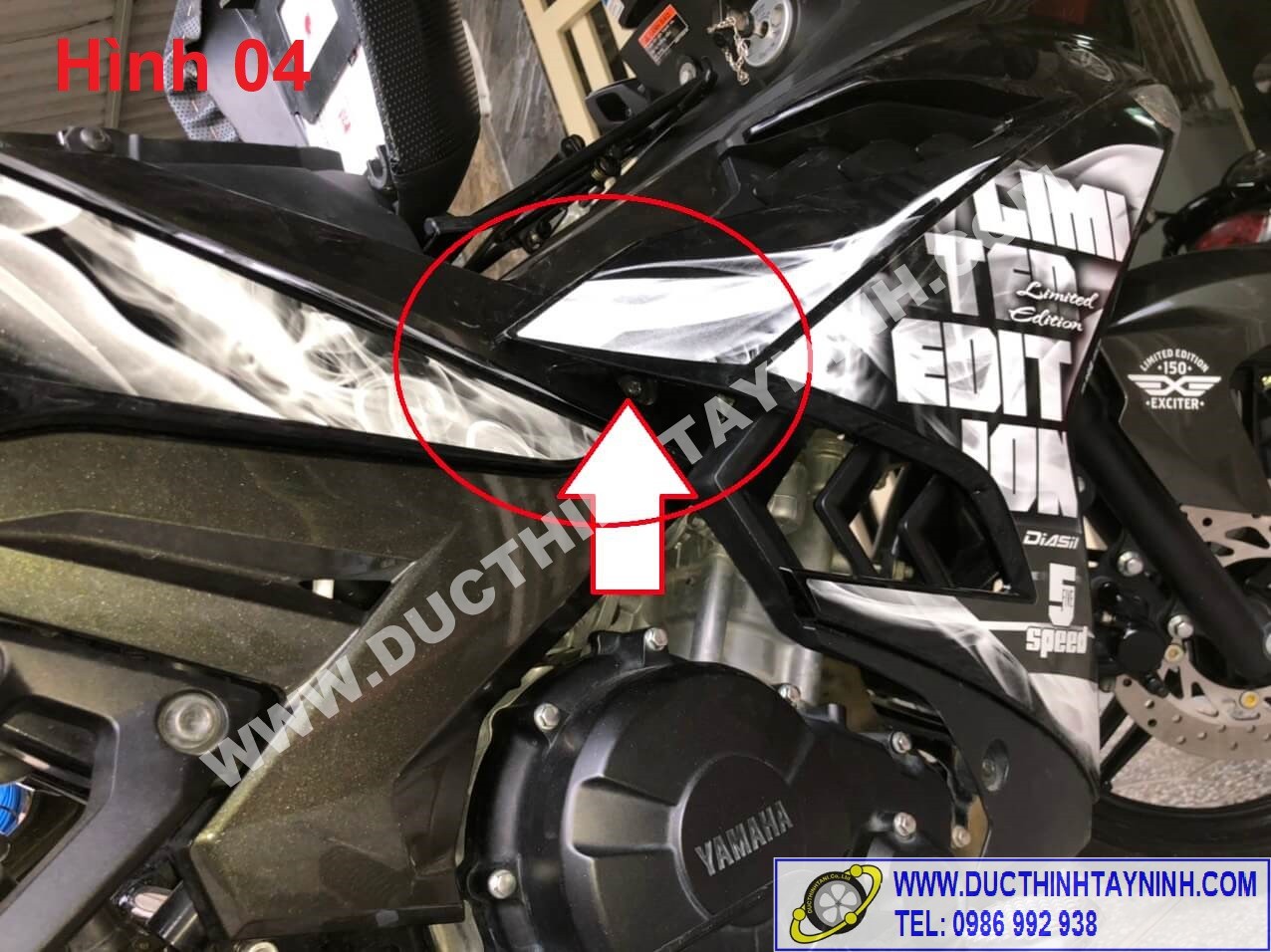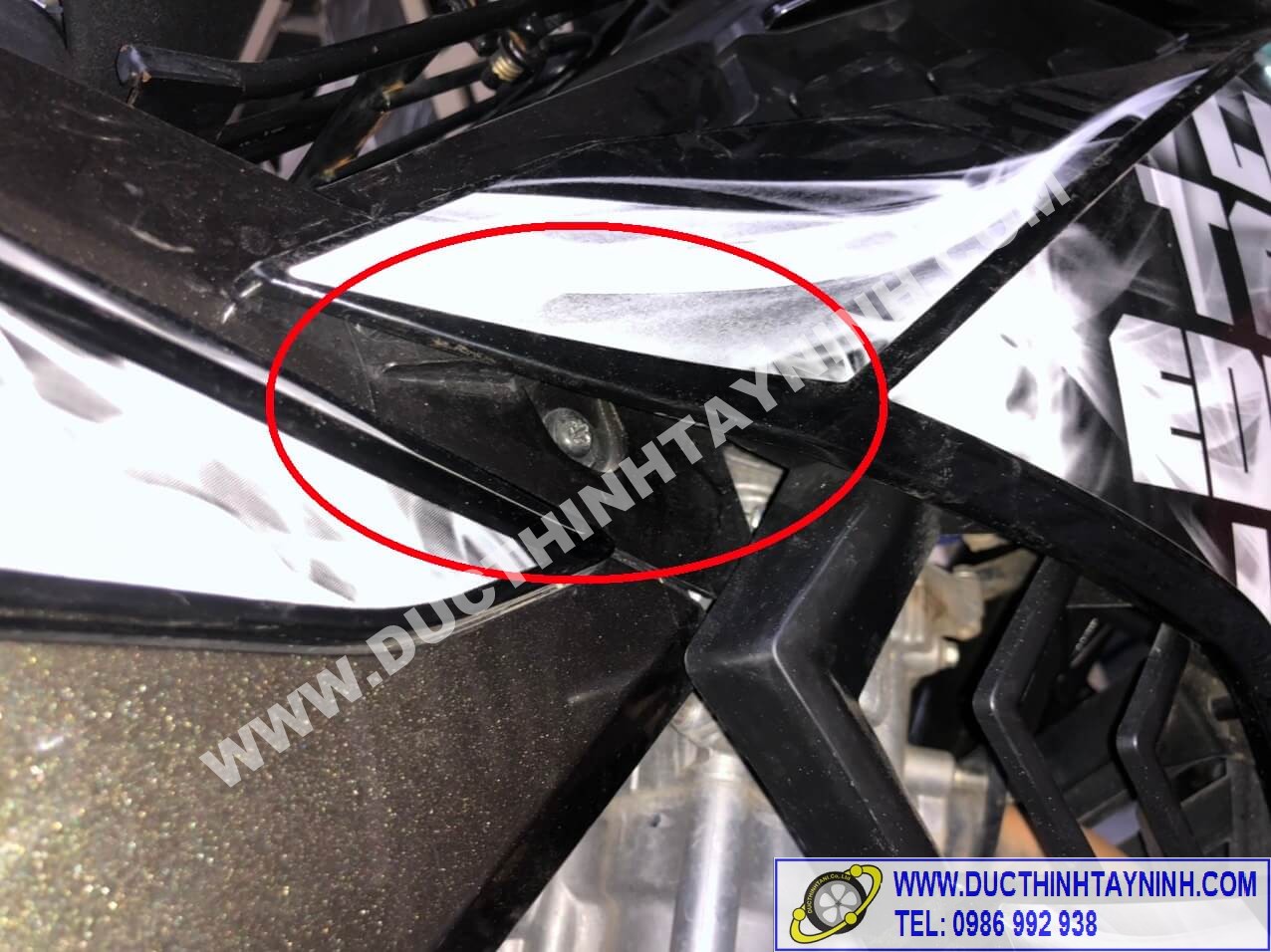 - Ta mở phần ốp mũ đuôi sau bình thường, nhìn các ốc vít là biết, riêng ốp phía bên bô xe ta chú ý phải mở con ốc bị khuất bên trong chổ khoanh tròn của hình.