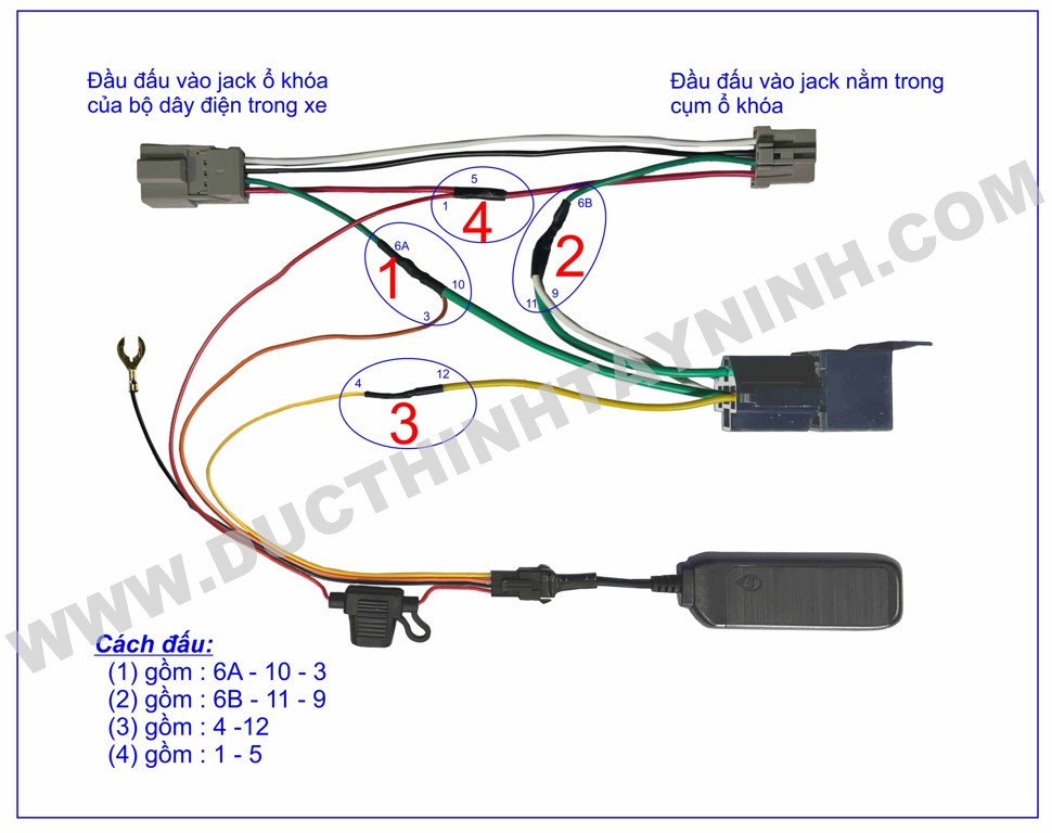 Sau khi đã xác định được thứ tự được dây dương (+) và dây tắt máy (Acc) trong bộ Jack đấu nối, ta cắt dây tắt máy ( Acc) ra làm đôi và tiến hành đấu như hình bên dưới