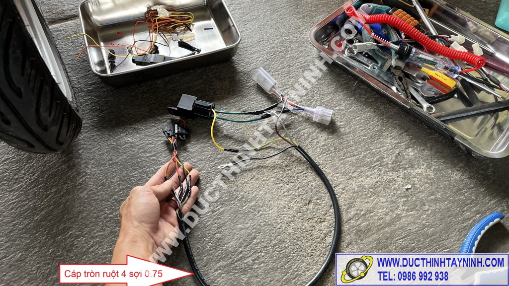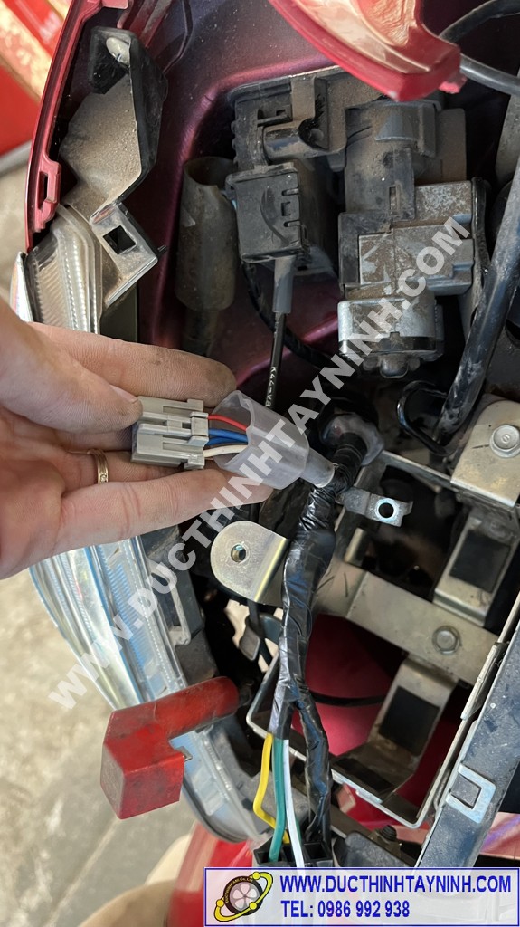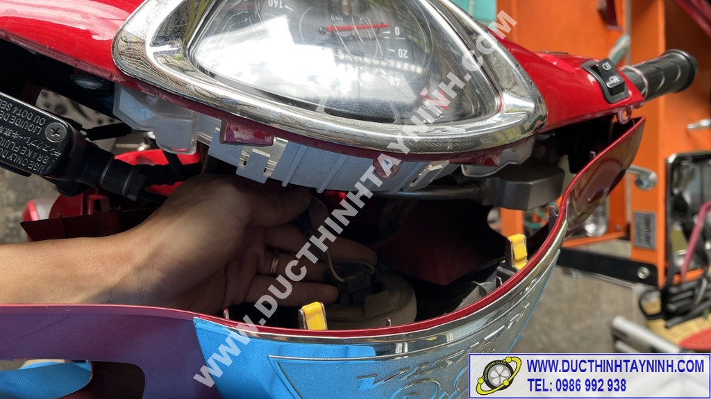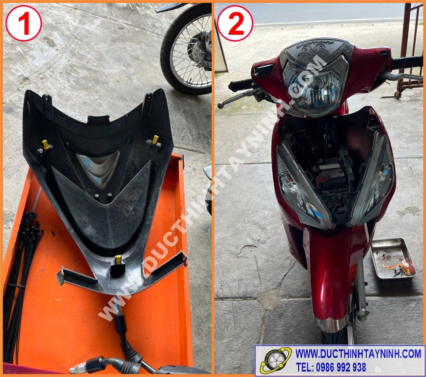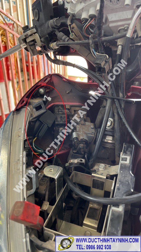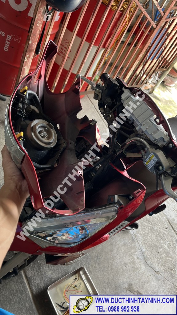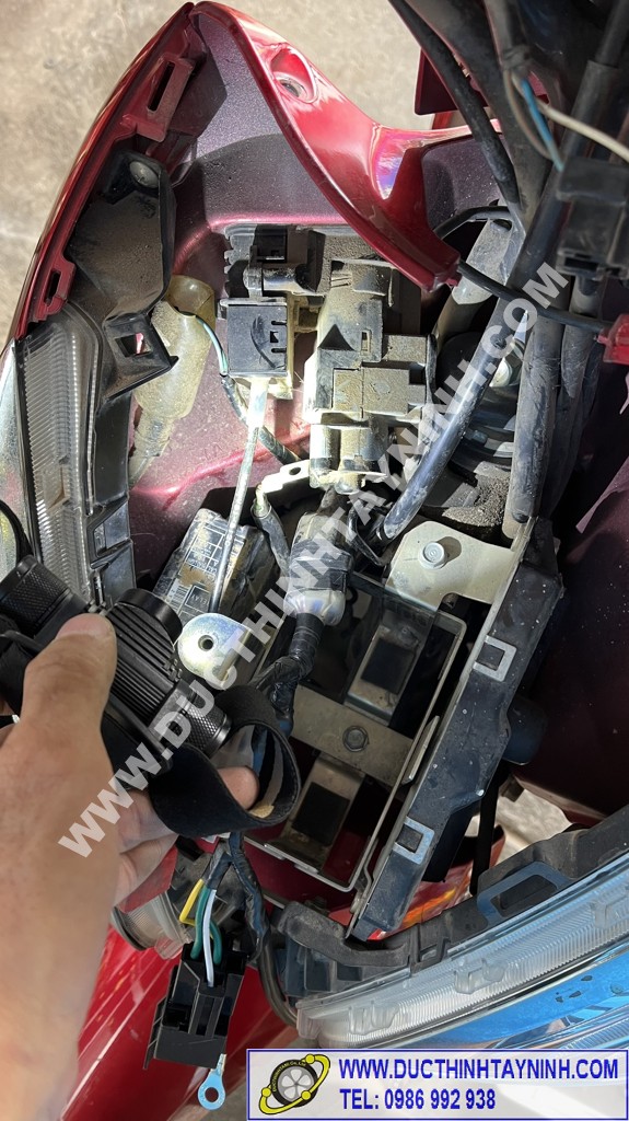 Lắp cụm đèn pha vào, kiểm tra lại các bộ phận của xe : đèn pha ( cos, pha) + xi nhan (trái, phải) + đèn stop, còi