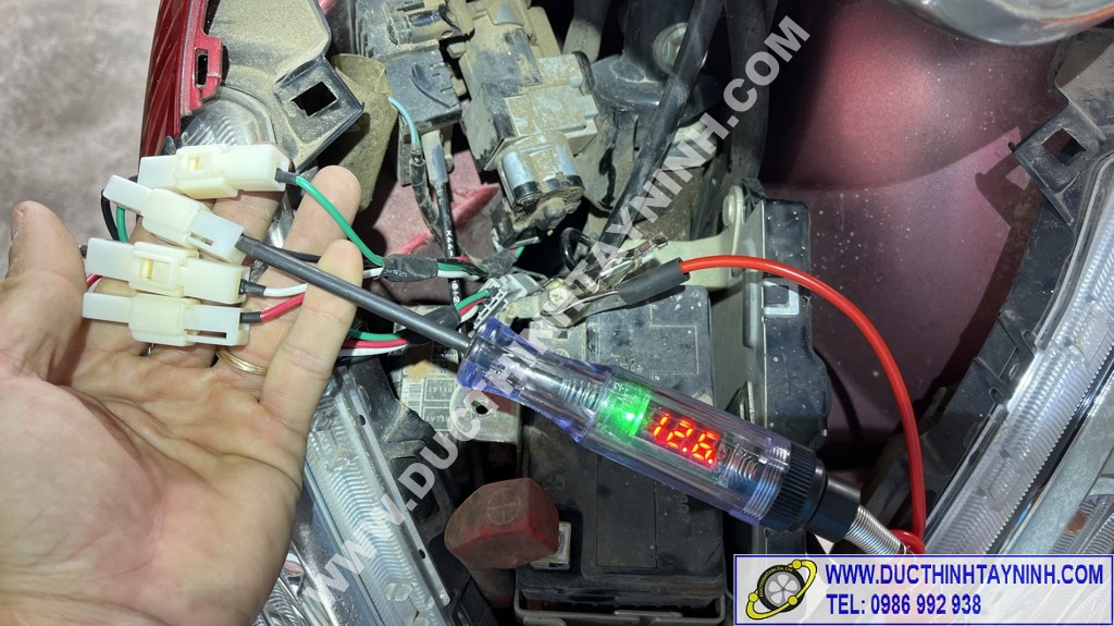 Lắp Jack test vào ổ khóa xong, sau đó lắp tạm bình acquy lại để xác định dây (+) và dây tắt máy ( Acc)