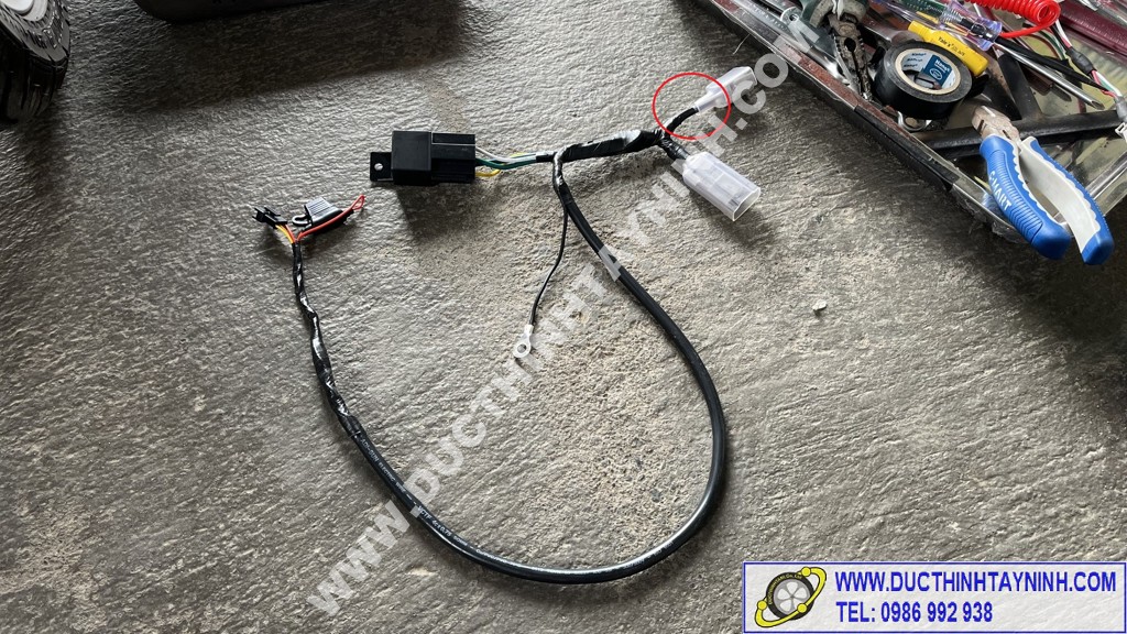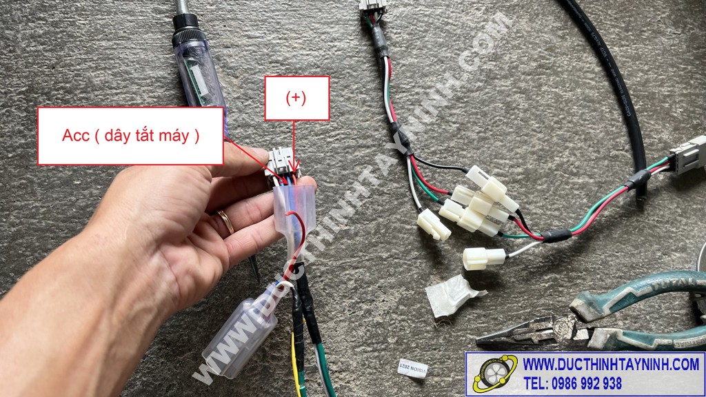 Sau khi xác định xong dây (+) và dây tắt máy ( Acc), ta tháo bình acquy và bộ jack test ra, tiến hành đấu dây nguồn