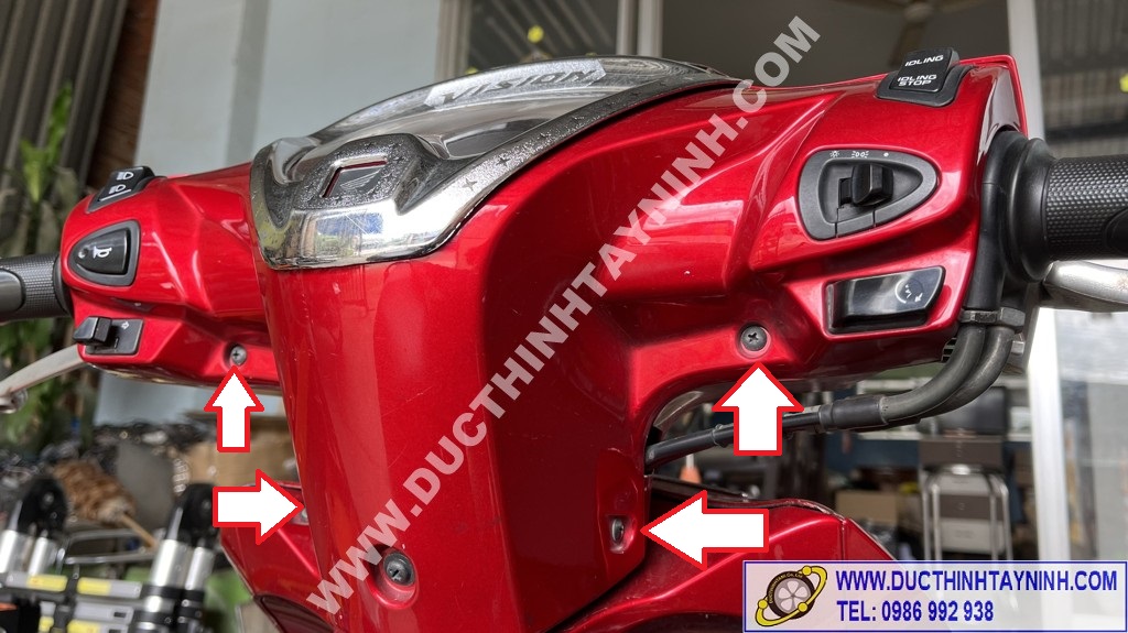 Tháo cụm đèn pha : mở 2 kính chiếu hậu + 4 ốc vít