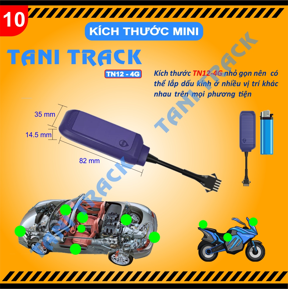 - Thiết bị định vị xe máy - ô tô TaniTrack có thiết kế nhỏ gọn, tiết kiệm điện năng, chống nước tốt. Do vậy, thiết bị có thể lắp trên các loại xe khác nhau
