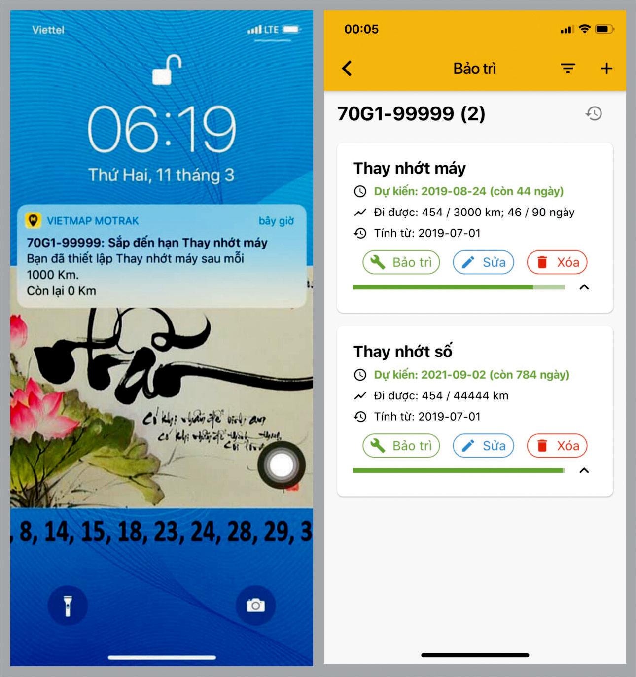 - Ở chức năng cho phép người dùng thiết lập chế độ nhắc nhỡ định kỳ bảo dưỡng xe theo thời gian hoặc số km xe chạy, khi xe chạy đến thời gian hoặc số km đã thiết lập thì trên phần mềm sẽ hiện thông báo nhắc nhỡ người dùng đã đến lịch bảo dưỡng xe.