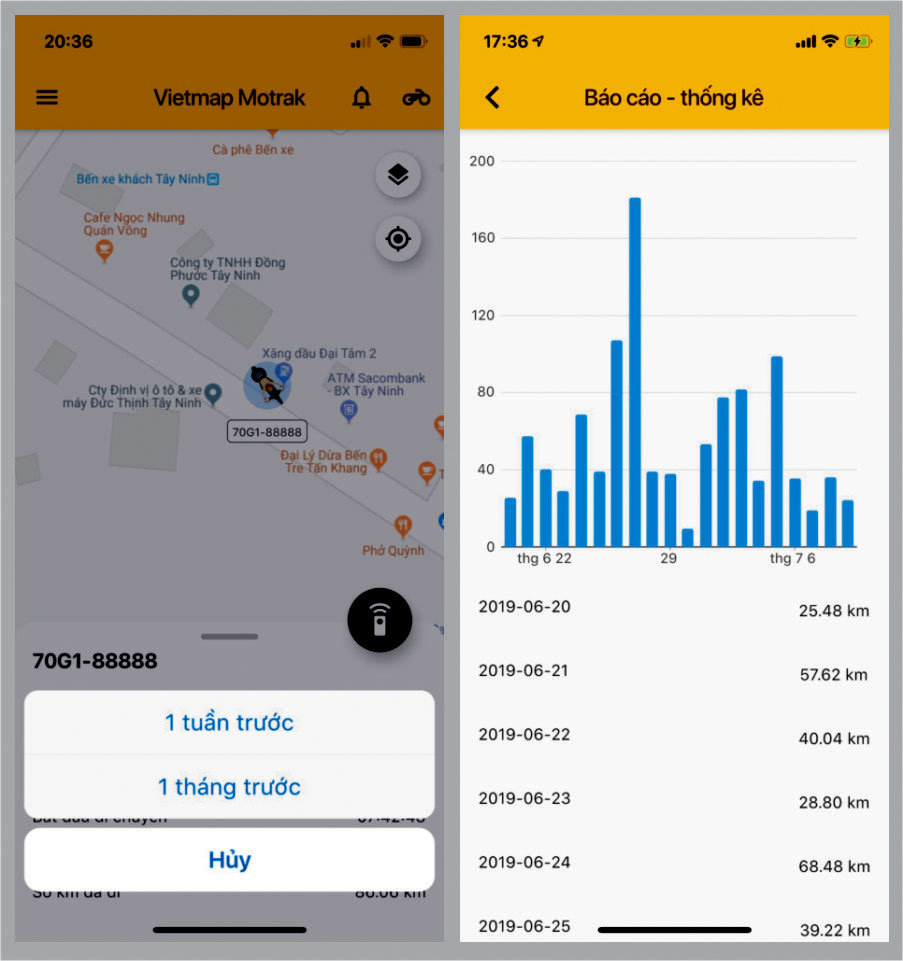 - Cho phép người dùng xem báo cáo quãng đường đi được trong tuần, trong tháng theo dạng biểu đồ rất trực quan, giúp người dùng kiểm tra, so sánh rất nhanh tình trạng xe chạy nhiều hay ít trong các ngày đã qua.