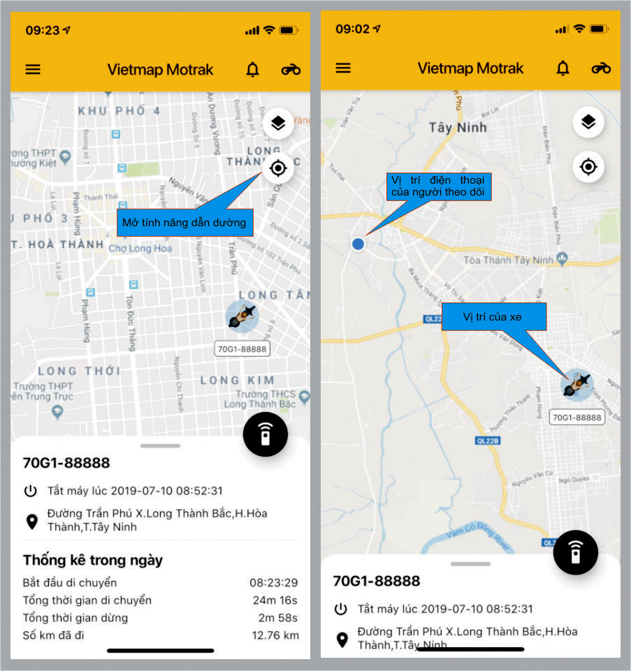 - Khi người dùng chọn vào chức năng dẫn đường thì trên phần mềm sẽ cho ta thấy song song cùng một lúc 2 vị trí, vị trí của điện thoại và vị trí của xe. Khi điện thoại di chuyển thì biểu tượng của điện thoại (vòng tròn màu xanh) trên bản đồ cũng di chuyển theo.