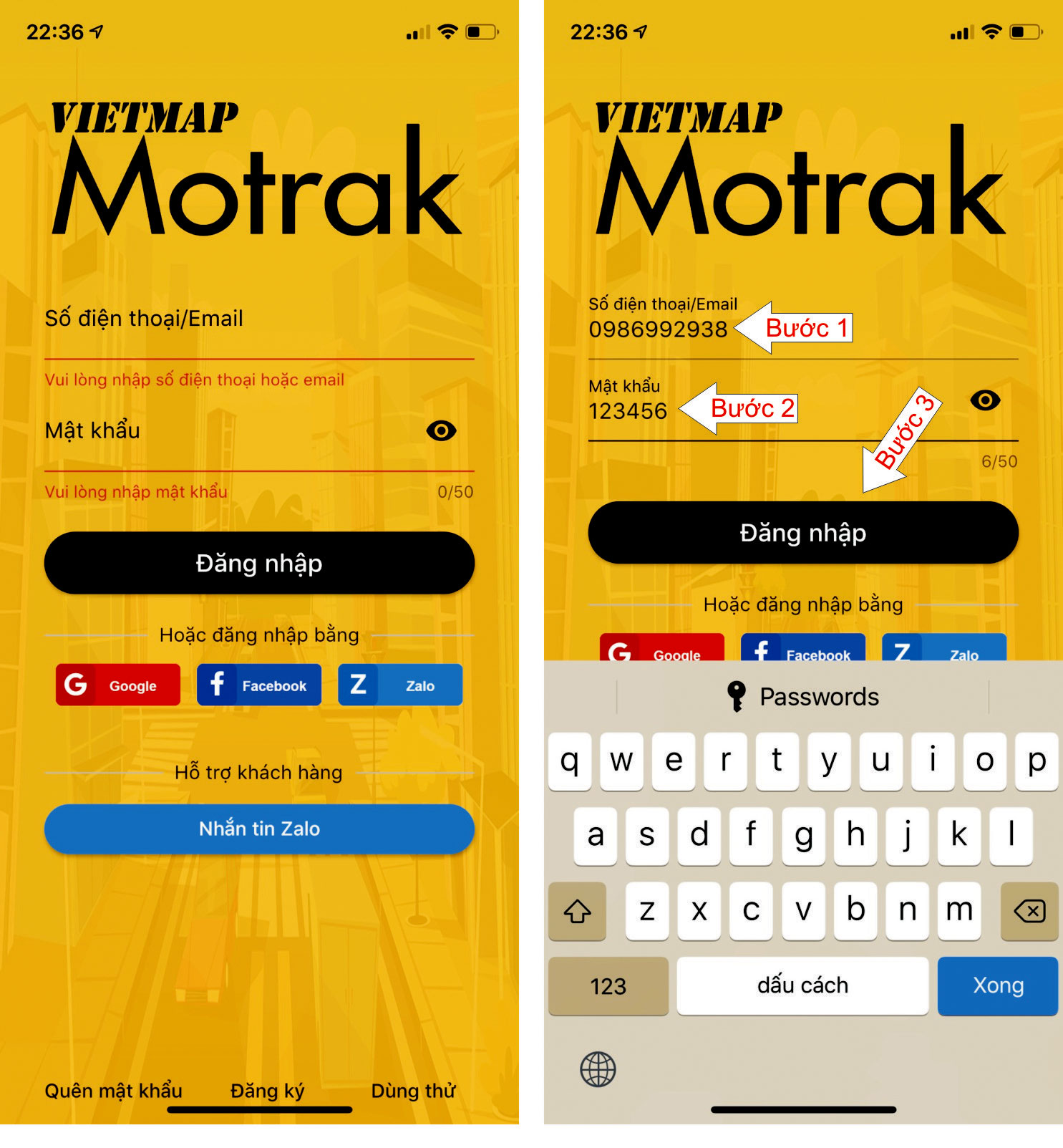 Sau khi cài phần mềm Vietmap Motrak vào điện thoại, quý khách đăng nhập với thông tin như sau :
